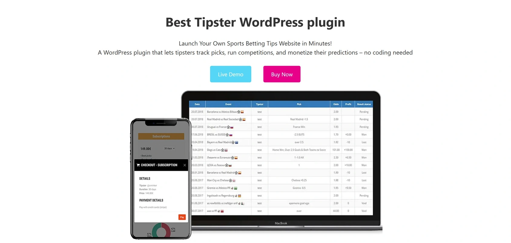 Tipster Script is our commercial WordPress plugin for tipsters—publish predictions, show stats/leaderboards, manage subscriptions, and (with a data feed) auto-grade results.